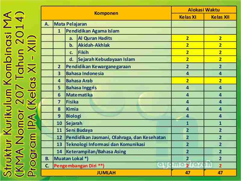 Demikianlah struktur kurikulum MA berdasarkan KMA No. 207 Tahun 2014. Semoga membantu rekan-rekan pengambil kebijakan di madrasah utamanya dalam penyusunan jadwal mengajar dan pembagian tugas mengajar di Madrasah Aliyah.
